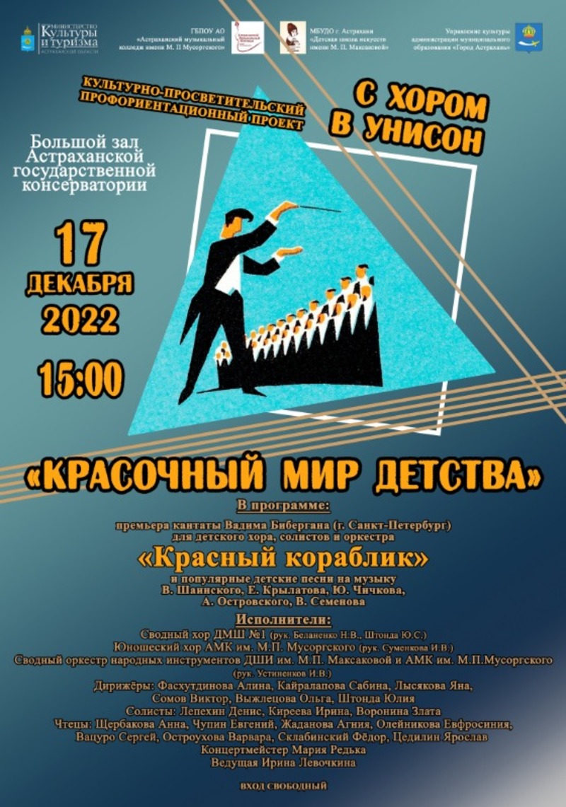 В большом зале Астраханской государственной консерватории в 15:00 17 декабря пройдёт концерт «Красочный мир детства». Это уже вторая программа проекта «С хором в унисон» на тему детского песенного творчества.