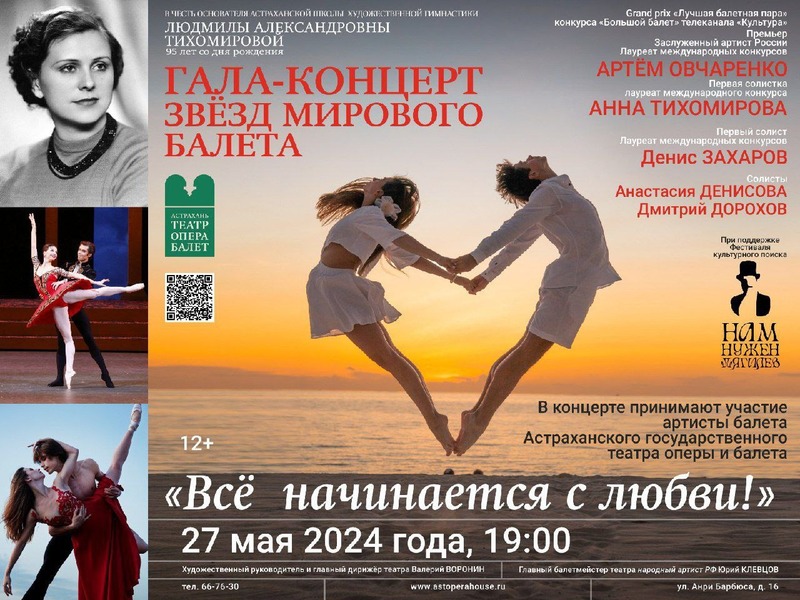 В театре оперы и балета 27 мая в 19:00 состоится концерт, посвящённый 95-летию основателя астраханской школы художественной гимнастики Людмилы Тихомировой. В программе «Всё начинается с любви» будут задействованы звёзды мирового балета, артисты Большого академического театра России и астраханские солисты.