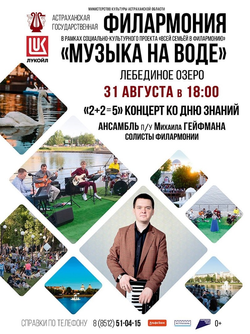 Мероприятие продолжает серию концертов под открытым небом «Музыка на воде», которая проводится в рамках совместного с компанией «ЛУКОЙЛ» проекта «Всей семьёй в филармонию». Музыковед Ангелина Степанова представит развлекательную музыкальную программу на свежем воздухе, которая будет интересна всей семье.