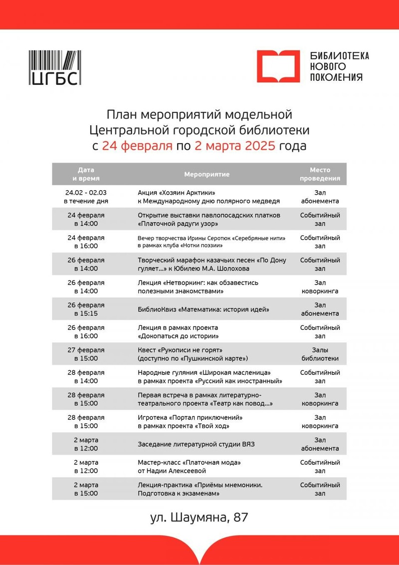 Также в модельной библиотеке на улице Шаумяна, 87, 28 февраля в 14:00 пройдёт мероприятие «Широкая Масленица» в рамках проекта «Русский как иностранный». Кроме того, на предстоящей неделе будет организована первая встреча участников литературно-театрального проекта «Театр как повод…», состоится библиоквиз и будет работать игротека. А 26 февраля в 14:00 в честь юбилея писателя Михаила Шолохова здесь организуют творческий марафон казачьих песен «По Дону гуляет…».