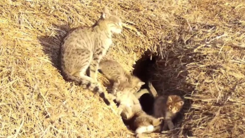 Во время очередного объезда государственные инспекторы «Степного» обнаружили в сене уютную норку. Чтобы понять, кто там обитает, они установили фотоловушку. Через год камера зафиксировала трогательные кадры: степная кошка с котятами гуляла рядом с норкой.