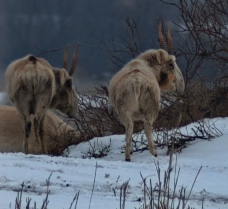 Группа сайгаков была достаточно крупной. Сначала животные держались на расстоянии 70–100 метров, но после того как их спугнули другие люди, часть стада вышла прямо на активистов.