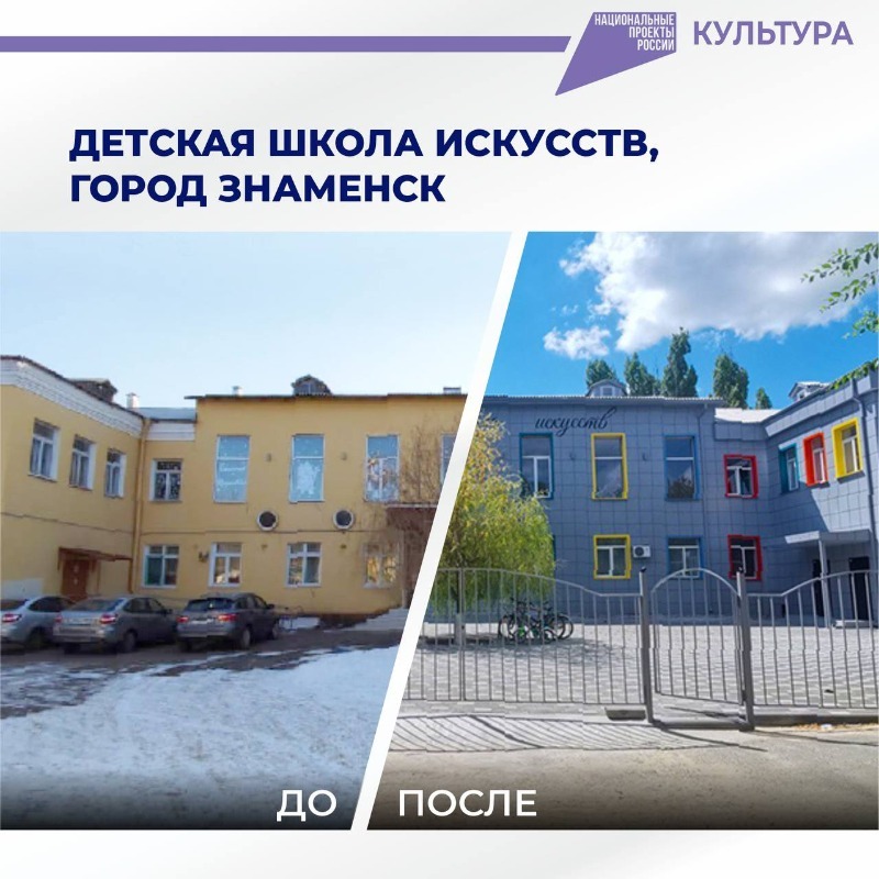 Зданию знаменской детской школы 55 лет. Такого масштабного ремонта здесь не было никогда. Специалисты обновили фасад и благоустроили территорию. Кроме того, также по нацпроекту «Культура» ДШИ получила два акустических пианино «Николай Рубинштейн» и оборудовали виртуальный концертный зал.