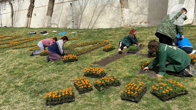 А специалисты МБУ «Зелёный город» украшают надпись «Астрахань» на откосе кремля оранжевыми бархатцами.