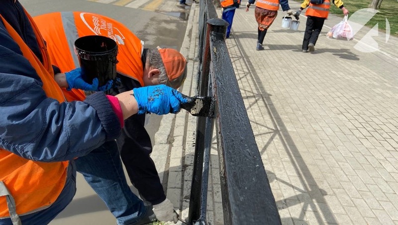 Другие весенние работы по благоустройству на Ленина тоже идут полным ходом. Так, сотрудники МБУ «Чистый город» красят леерные ограждения и мусорные урны.