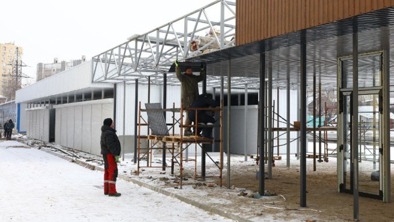 Строительные работы на месте пожара начались в декабре прошлого года. Территория была расчищена и выровнена, уложена тротуарная плитка. Параллельно смонтировали металлические конструкции новых торговых павильонов и провели их утепление. На данный момент осталось подключить электричество и навесить рольставни. Всего здесь будет организовано около ста торговых мест.