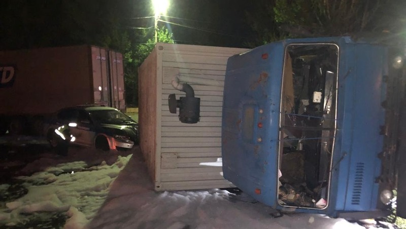 В какой-то момент произошло повреждение переднего колеса, из-за чего водитель не справился с управлением. Автомобиль столкнулся с КамАЗом, который остановили сотрудники Госавтоинспекции, и с патрульной «Шкодой». После этого совершил наезд на вагончик весового контроля.