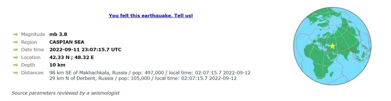 На сайте Европейского Средиземноморского сейсмологического центра рассказали, что 12 сентября в 02:07 по московскому времени толчки магнитудой 3,8 балла они зарегистрировали на глубине 10 километров. Координаты – 42.33 N; 48.32 E.