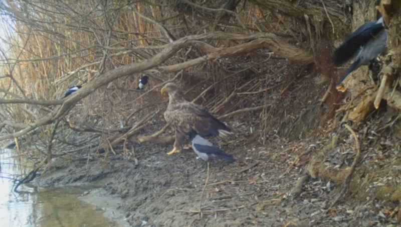 Птицы попытались хитростью отобрать добычу у хищника, но сначала вступили в громкий конфликт между собой, не сумев договориться о дележе. В итоге орлан-белохвост был вынужден спасаться от назойливой пернатой братии вместе с рыбой в кустах.