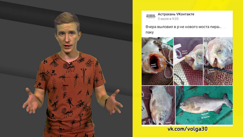 Пиранья Паку на фото. Рыбак в соцсети утверждает, что выловил её в Волге в районе Нового моста. Астраханцы скептически относятся к подобным «сенсациям». Вот и тут кое-кто усомнился, а не из аквариума ли рыбка? Да и знатоки-ихтиологи нашлись на просторах Интернета, объяснили, что рыбка травоядная, а зубищи ей такие нужны, чтобы орехи колоть.