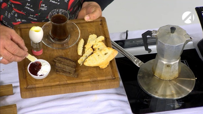 Перед едой у яйца нужно снять верхнюю часть скорлупы и затем макать готовые гренки в желток.