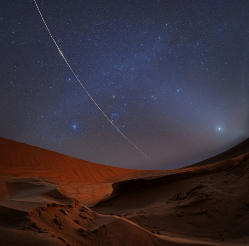 Линия на левой части фотографии — трек движения Международной космической станции. А яркий объект справа, рядом с горизонтом — Венера.