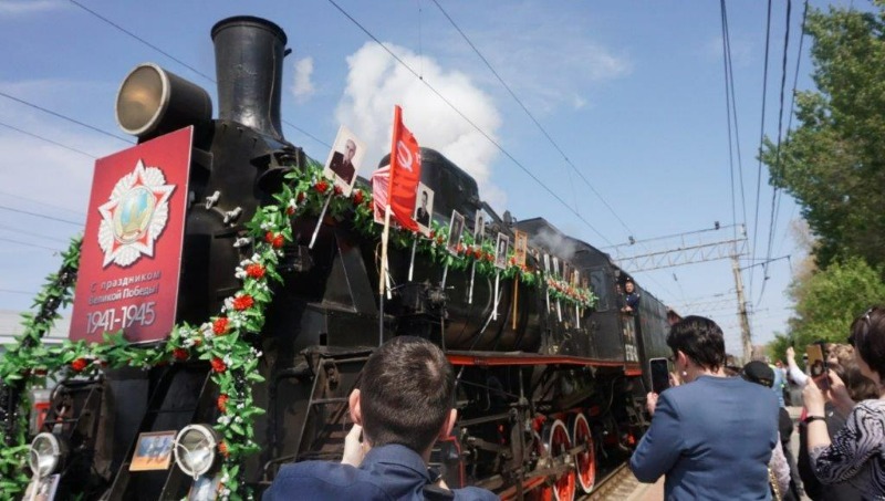 На перроне станции Астрахань-1 состав встретили начальник Приволжской железной дороги Сергей Альмеев, зампред правительства Астраханской области Денис Афанасьев, депутат Думы Астраханской области Инна Ирдеева и другие почётные гости. Они возложили венок и цветы к монументу «Слава защитникам Отечества» в парке Железнодорожников.