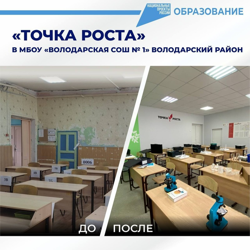 По нацпроекту «Образование» в Володарской школе № 1 появился образовательный центр «Точка роста». Там отремонтировали кабинеты, установили современное оборудование. Таким образом качество образования повысится, а возможности школьников в освоении учебных предметов расширятся. Занятия проводят по четырём областям: химия, биология, физика, информатика.