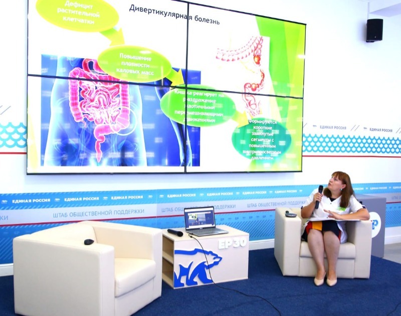 Врач Центра общественного здоровья и медицинской профилактики Ольга Базаева подробно остановилась на распространённых заболеваниях желудочно-кишечного тракта: желчекаменной болезни и дивертикулёзе. Кстати, в XX веке отмечен десятикратный рост числа заболевших дивертикулёзом. Причина — неправильное питание, отсутствие в рационе необходимого количества овощей и фруктов, клетчатки.