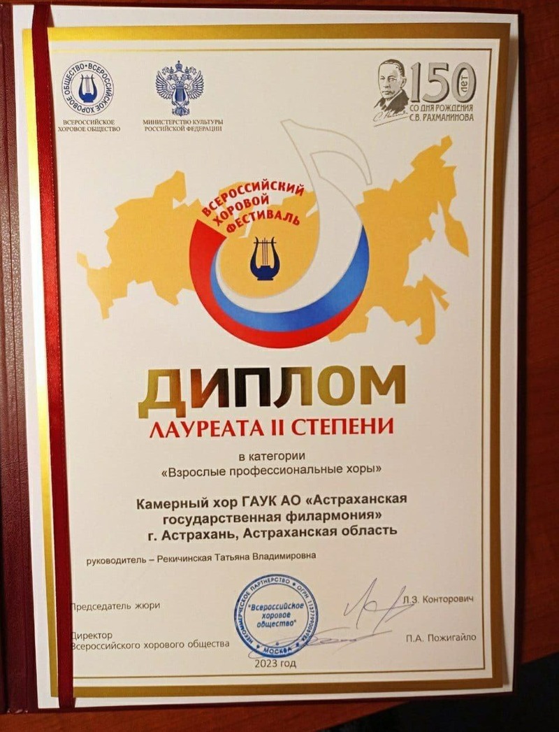 Диплом и приз был вручён руководителю коллектива Татьяне Рекичинской директором Всероссийского хорового общества Павлом Пожигайло и председателем жюри конкурса Львом Конторовичом, рассказывают в министерстве культуры региона.