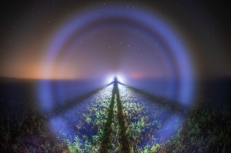 Отличный эффект «горного призрака» можно увидеть и ночью. Достаточно направить свет фонаря на человека или предмет, и его тень гротескно вытянется и «отпечатается» на тумане.