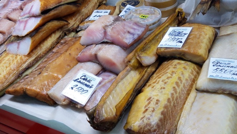 Наибольшее интерес вызывает рыбный ассортимент: копченая стерлядь за 3000 рублей за килограмм, вяленый осётр за 5500 рублей, горячего копчения — за 3900 рублей. Вяленый сом обойдётся в 2500–2900 рублей за килограмм, вяленая вобла — в 1000–1300 рублей, копчёный лещ — в 500 рублей за килограмм.