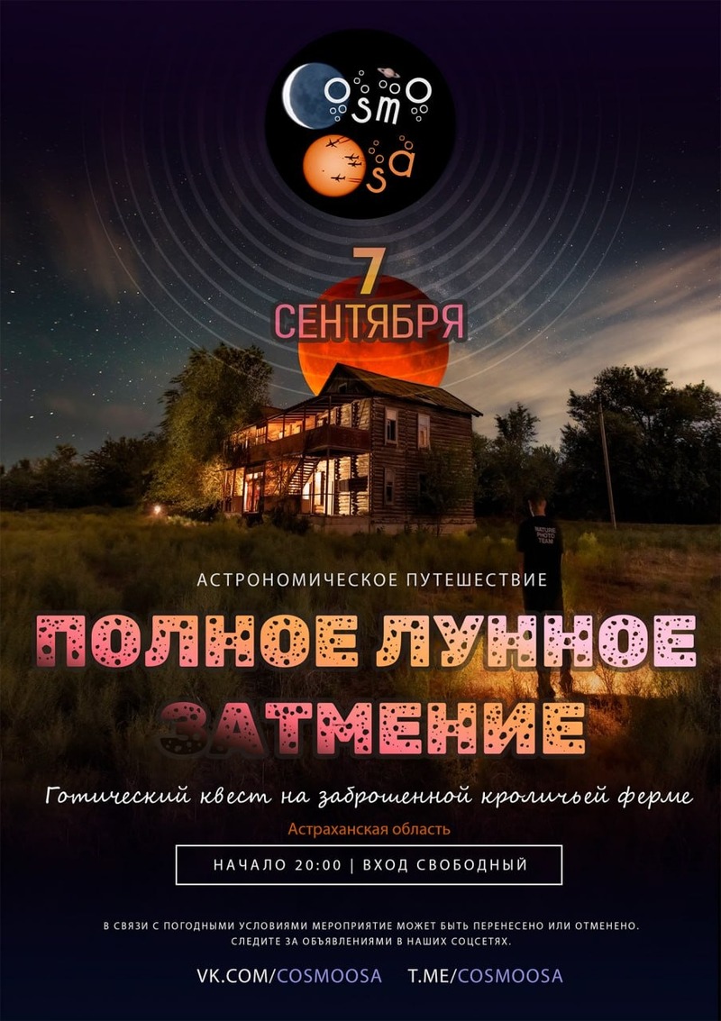 В программе вечера — лекция о природе затмений, викторина с призами и наблюдение за астрономическим явлением через три телескопа с выводом изображения на большой экран. В 20:30 начнётся частная фаза затмения, а в 22:11 ожидается максимальная фаза. После этого участников ждёт готическо-астрономический квест на заброшенной ферме и лазерная экскурсия по звёздному небу.