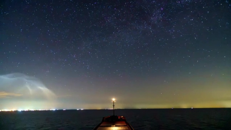 По информации из сообщества «Космо-Оса», наш земляк с корабля заснял волшебный момент встречи земли и неба. Над Керченским проливом словно простирается полотно из бриллиантов звёзд. Их равномерное мерцание какое-то время нарушает лишь хаотичное движение «светлячков», спешащих по небу.