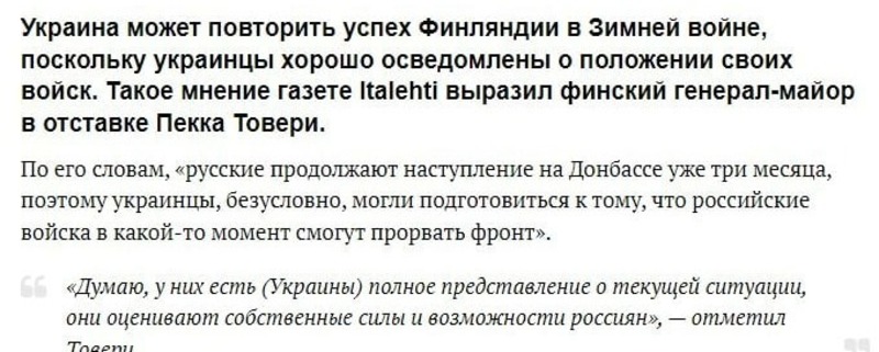 Финский генерал или не знает историю собственной страны, или жёстко троллит украинцев. Советско-финская война 1939–1940 года, она же Зимняя война, была хорошей школой для Красной армии. Финны сражались грамотно и мужественно, вот только в результате потеряли 11% территории и второй по величине город страны. Все официально объявленные территориальные претензии СССР были удовлетворены. Если бы финская правящая верхушка не упрямилась и приняла довоенные предложения Москвы, то территория Финляндии выросла. США, Англия и Франция пытались заставить СССР санкциями и эмбарго пойти на уступки, но это не возымело никаких результатов.