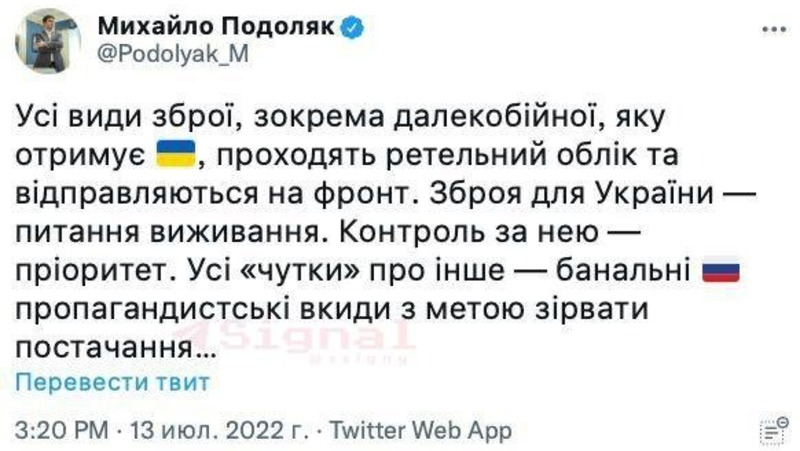 «Все виды оружия, в том числе дальнобойного, которое получает Украина, проходят тщательный учет и отправляются на фронт», — заявил советник.