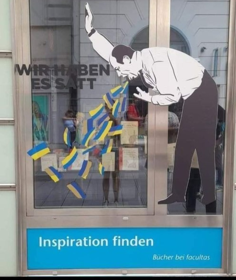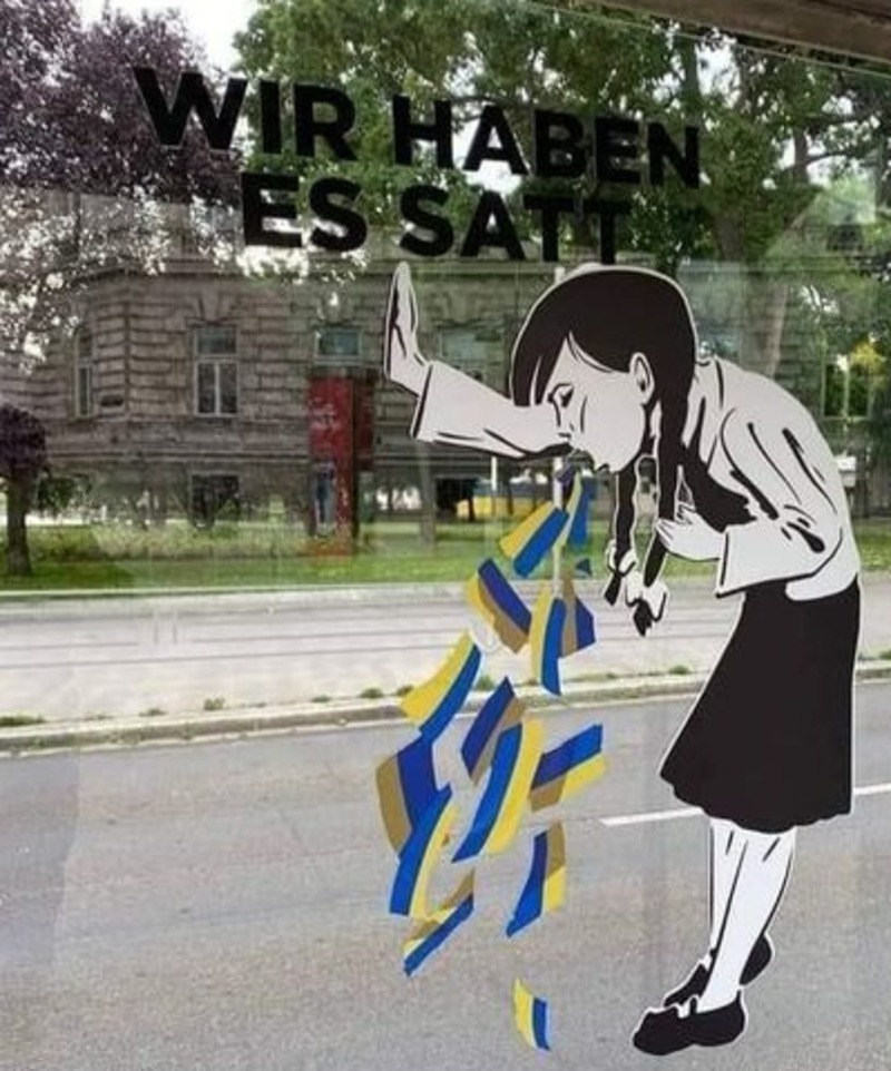На наклейках изображён человек, которого тошнит от украинских флажков, и слоган Wir haben es satt, что означает «Мы сыты по горло».