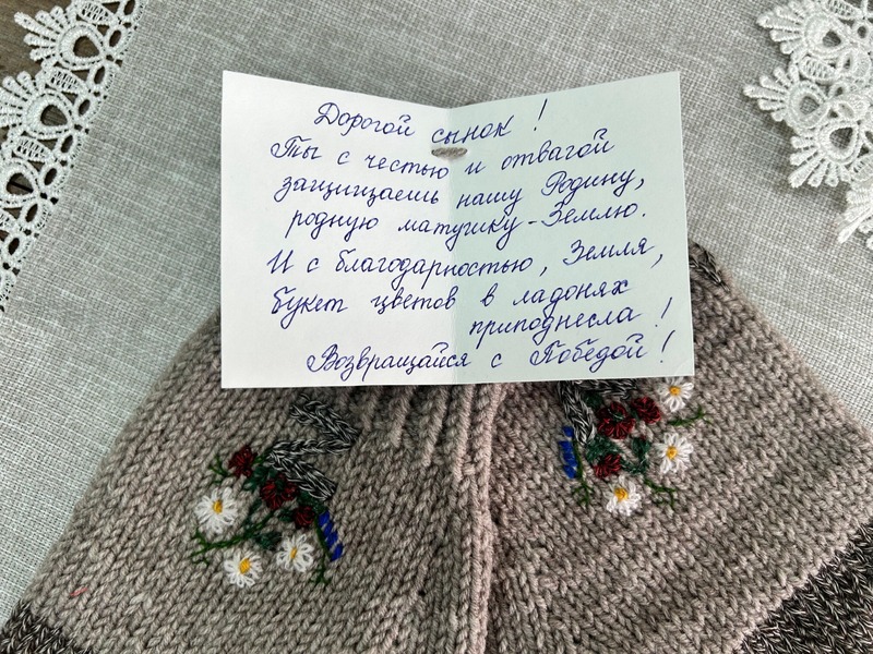 «Дорогой сынок! Ты с честью и отвагой защищаешь нашу Родину! И с благодарностью Земля букет цветов в ладонях преподнесла! Возвращайся домой с победой!»