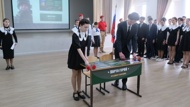 На церемонии открытия парты героя в родной школе бойца собрались его близкие, а также ученики гимназии № 1 и представители городской администрации.