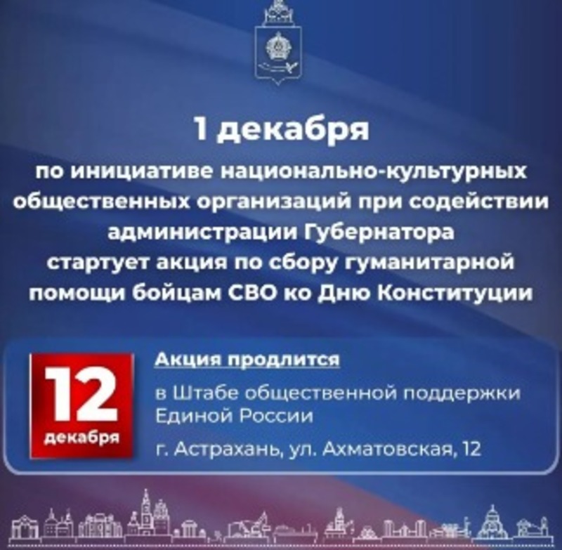 Сбор гуманитарной помощи будет организован в штабе общественной поддержки на улице Ахматовской, 12. Астраханцы смогут передать бойцам необходимые вещи, среди которых особенно востребованы предметы первой необходимости, личные гигиенические принадлежности и тёплая одежда.