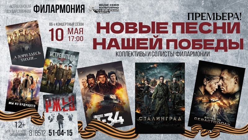 10 мая в стенах филармонии прозвучат песни военных лет, композиции из советских кинолент «Белорусский вокзал», «Особо важное задание», «Сыновья уходят в бой», саундтреки к современным фильмам о Великой Отечественной войне: «Т-34», «Битва за Севастополь», «Сталинград», «Мы из будущего», «Туман 2», «Ржев», «А зори здесь тихие», «Истребители». Перед зрителями выступят эстрадно-джазовый оркестр под управлением Евгения Якушкина, камерный хор под управлением Татьяны Рекичинской, солисты филармонии Анастасия Толоконникова, Елена Дорохина, Константин Хрипушин, Сергей Евдокимов, Александр Марков, Анастасия Тарасова, Анна Забелина и Ольга Фомичёва. Начало концерта в 17:00.