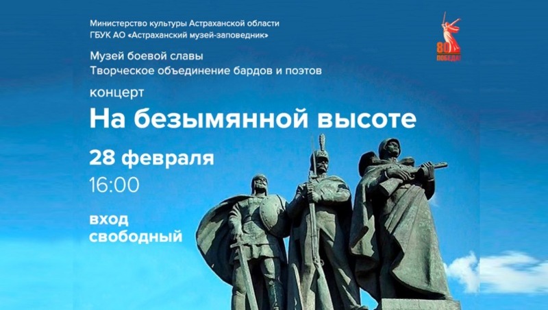 28 февраля в 16:00 в Музее боевой славы, в пространстве музейно-выставочного комплекса «Цейхгауз», состоится концертная программа «На безымянной высоте». Её организаторами выступили астраханское региональное отделение Союза писателей России и творческое объединение бардов и поэтов Астрахани. В программе прозвучат стихи и песни под гитару о воинской славе, чести и долге, а также о нелёгких дорогах к победе.