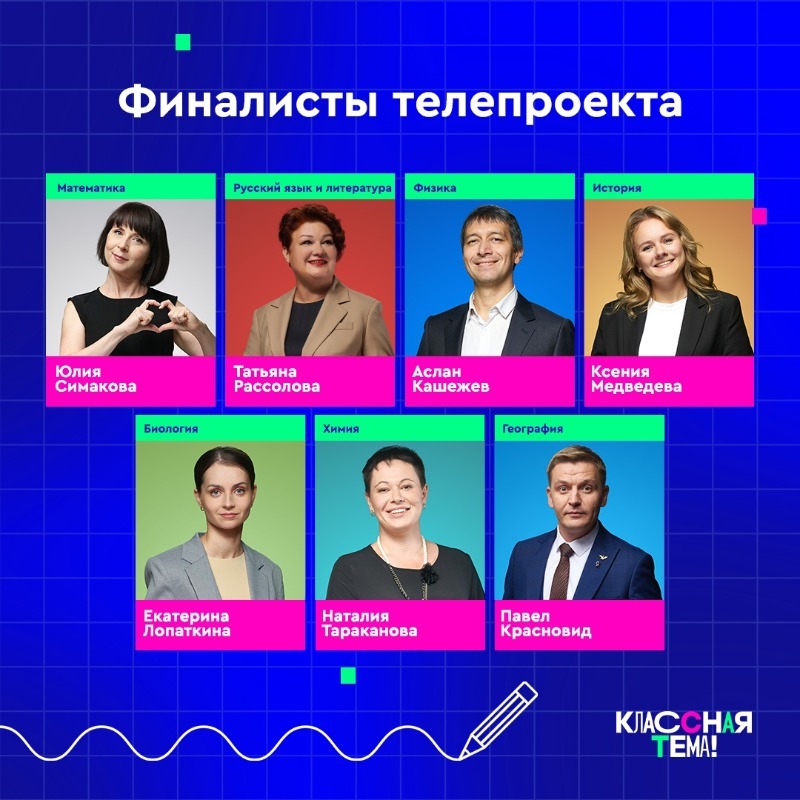 «Нам стали известны семь финалистов. Мы их поздравляем, они получат возможность провести урок телешоу „Классная тема!“ в эфире телеканала „Россия 1“ для гостей студии. Именно гости студии – известные учёные, космонавты, музыканты, популярные артисты – будут их учениками».