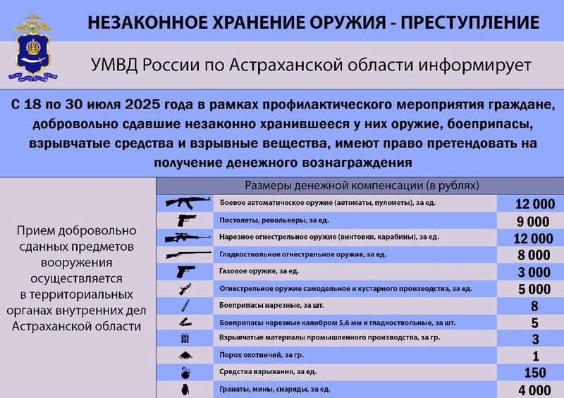 В период с 18 по 30 июля 2025 года жители Астраханской области могут легально сдать незаконно хранящееся у них оружие, боеприпасы и взрывчатые вещества. При этом они освобождаются от уголовной ответственности, сообщает пресс-служба регионального УМВД.