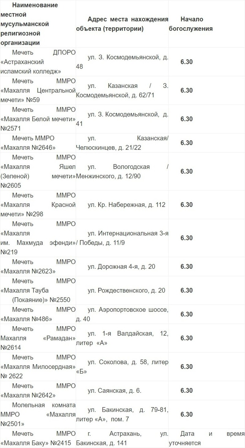 Мечети, в которых 21 апреля пройдут праздничные богослужения: