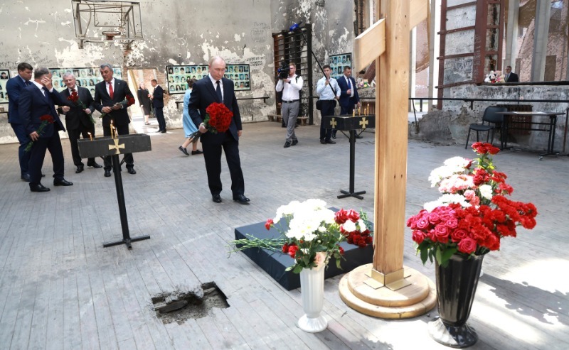 Сейчас школа № 1 в Беслане представляет собой мемориальный комплекс. Глава государства прибыл сюда впервые. Школьный спортзал, где боевики удерживали более 1,2 тысячи заложников, сохранён полностью в исходном виде, на его стенах размещены фотографии погибших. Посетители регулярно приносят к ним игрушки, цветы и бутылки с водой — так как террористы не давали захваченным людям еды и воды, те сильно страдали от жажды и голода. Каждый год в первые три дня сентября здесь проходит Вахта Памяти.