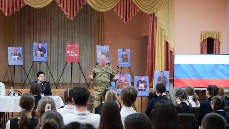 Вместе с детьми сотрудник ведомства посетил выставку фотографий «Отец героя». На ней можно увидеть портреты родителей военнослужащих, участвующих в специальной военной операции, которые держат в руках портреты своих сыновей.