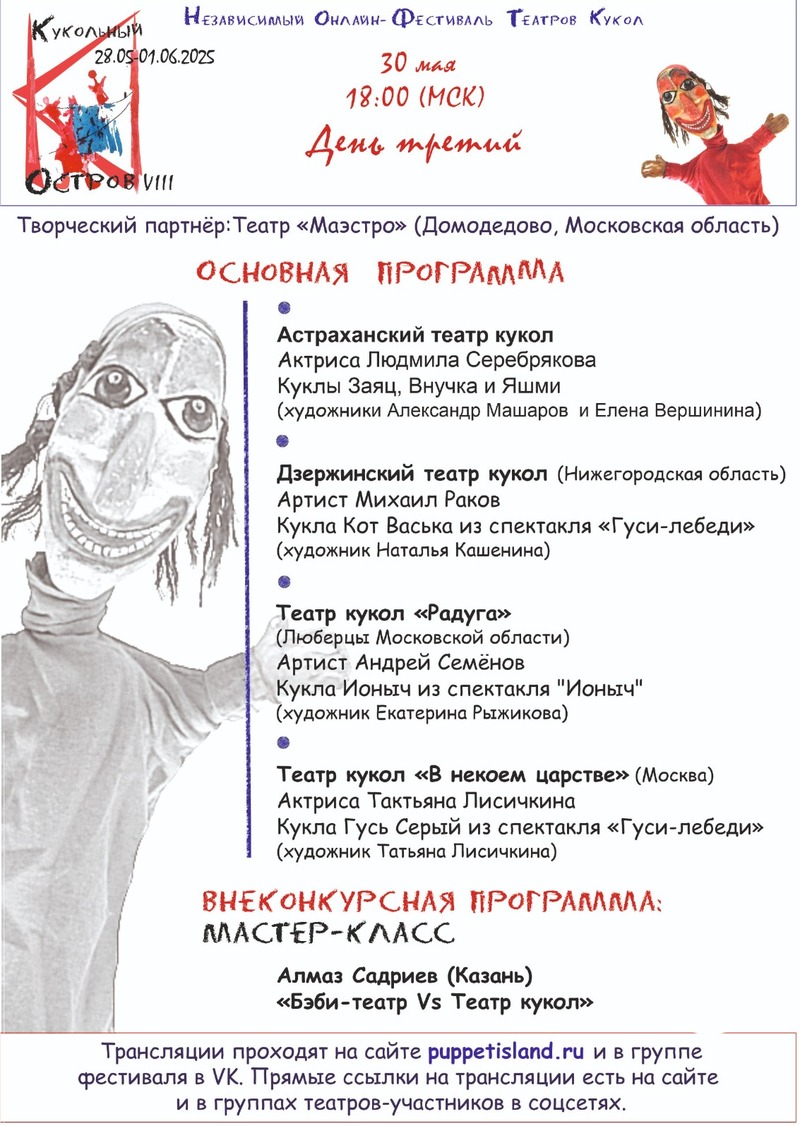 Астраханский театр кукол участвует в VIII Независимом онлайн-фестивале «Кукольный остров». В нём участвуют театры из Москвы, Ставрополя, Екатеринбурга, Астрахани, Тамбова, Ижевска, Нижегородской, Ивановской и Волгоградской областей, а также из Стамбула (Турция), Кавалы (Греция) и Авиньона (Франция). Лидеров в номинациях «Лучший артист», «Лучшая кукла» и «Театр, который хотелось бы посетить» выберет профессиональное жюри.
