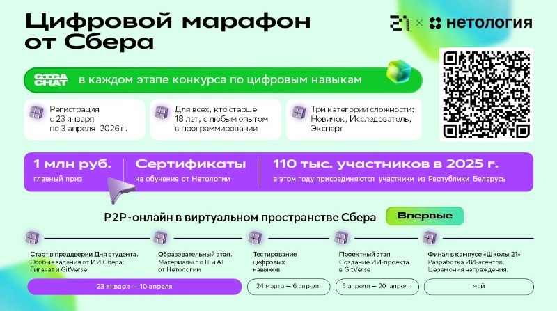 В этом году была внедрена важная инновация — создание виртуального пространства для участников. На этой платформе они смогут взаимодействовать друг с другом, участвовать в образовательных квестах, разработанных в том числе победителями прошлых конкурсов, изучать функционал нейросети ГигаЧат и выполнять задания от партнёров проекта — «Школы 21» и «Нетологии». Цель конкурса — помочь россиянам улучшить свои навыки цифровой грамотности, освоить современные технологии в сфере искусственного интеллекта, алгоритмического мышления и программирования.
