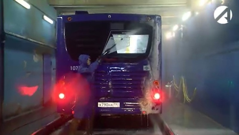 После того как транспорт заканчивает смену, он сразу заезжает в бокс. Автобус моют и внутри, и снаружи. Сначала на грязный автомобиль наносят пену, выдерживают пять минут, а после смывают под высоким напором воды. Дальше автобус проходит через атвоматические щётки. На один «Волгабас» уходит до двух минут. Сразу же за ним в бокс заезжает уже следующий автобус.