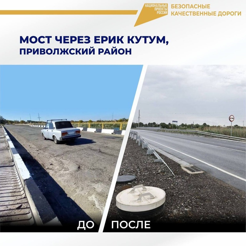 Капитальный ремонт прошёл и на мосту через ерик Кутум на автодороге Астрахань — Три Протока — Началово. Там полностью восстановили транспортные характеристики сооружения, привели к нормативам габариты.
