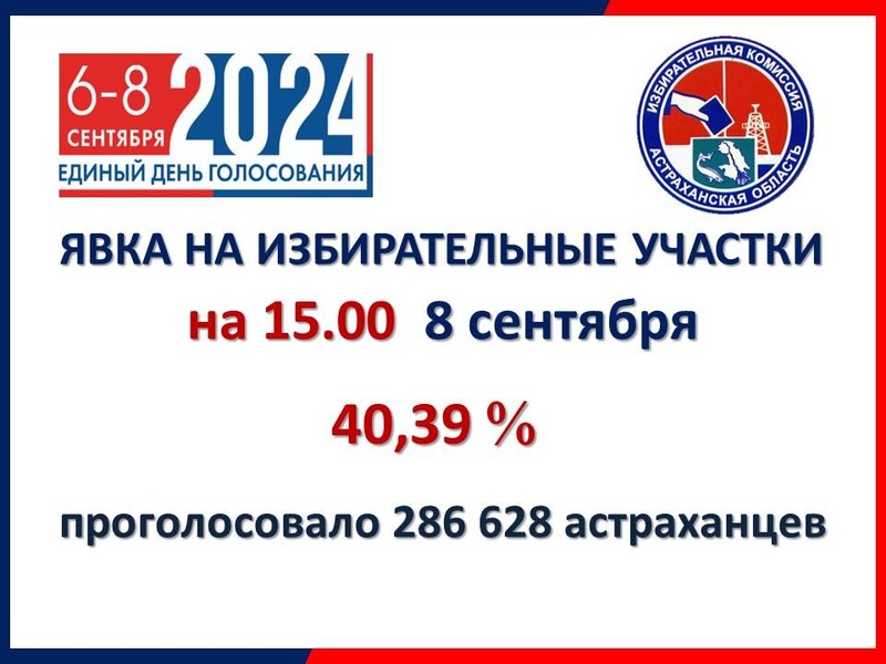 На 15:00 8 сентября в выборах приняли участие 286 628 астраханцев, что составляет 40,39 % от общего числа избирателей.