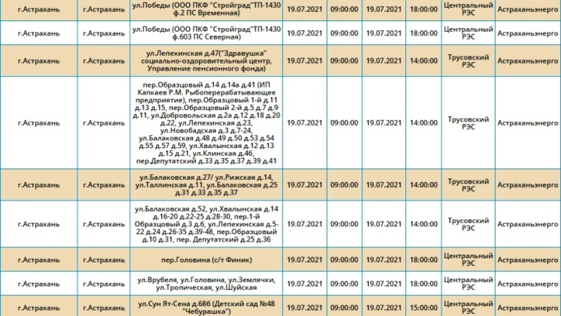 Адреса и время отключения электроэнергии в Астрахани на 19 июля: