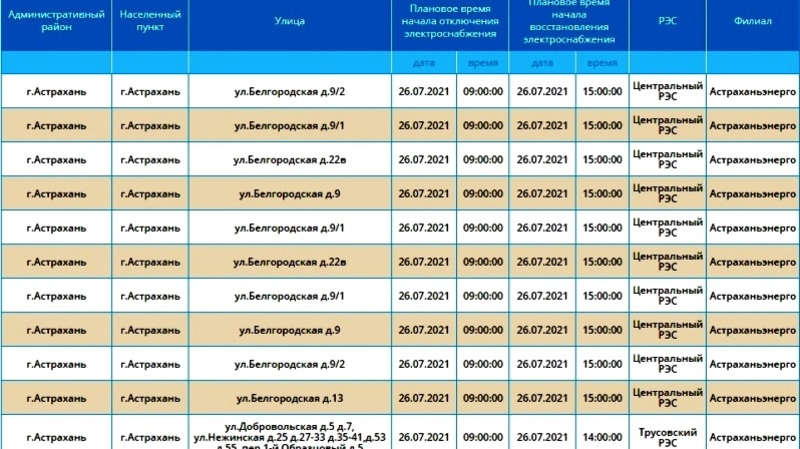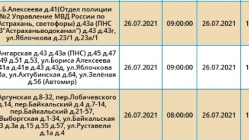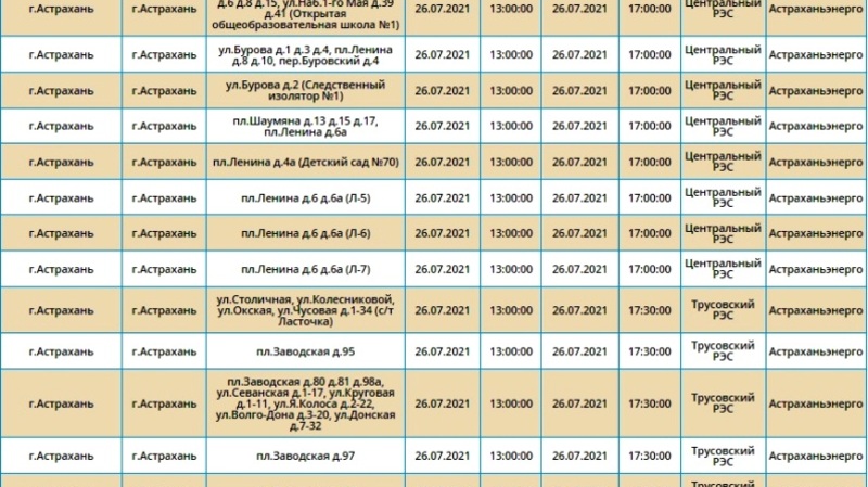 Адреса абонентов и время отключений в Астрахани на 26 июля:
