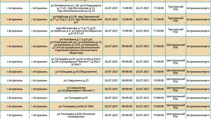 Согласно графику плановых отключений и проведения профилактических работ ПАО «Россети Юг – Астраханьэнерго», 26 июля в Астраханской области останутся без света дома в Астрахани и 9 поселениях.