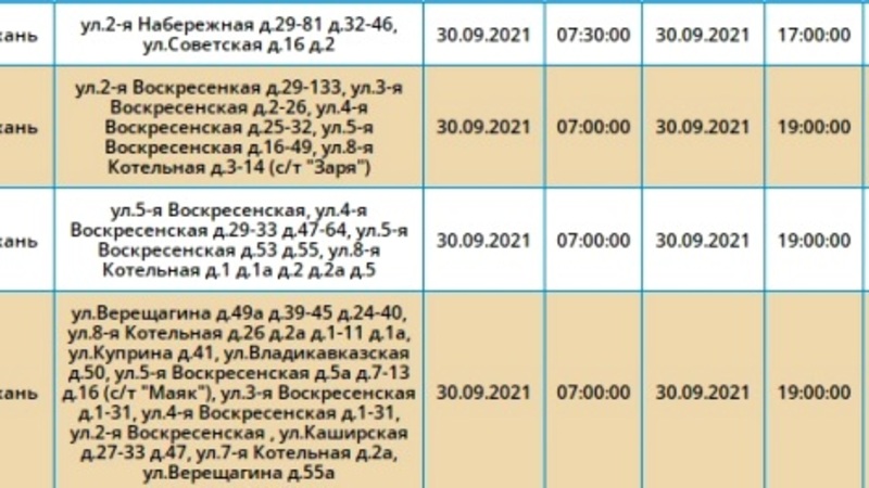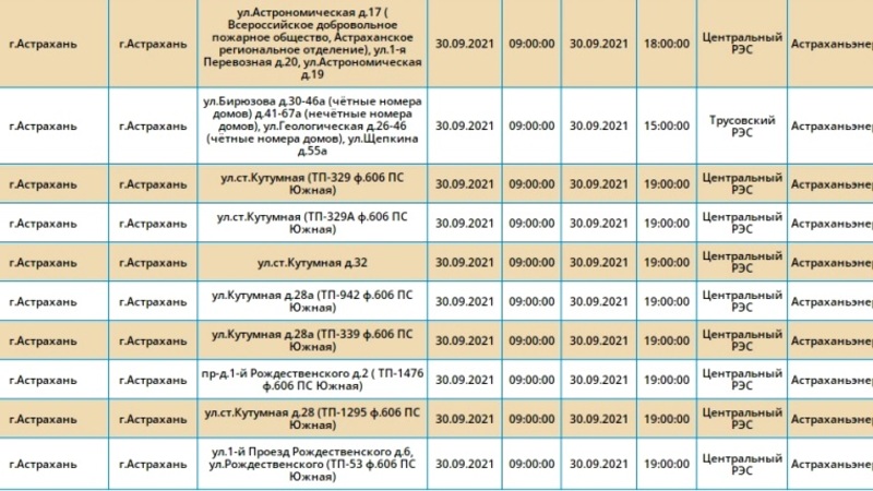 Адреса абонентов и время отключений в Астрахани на 30 сентября: