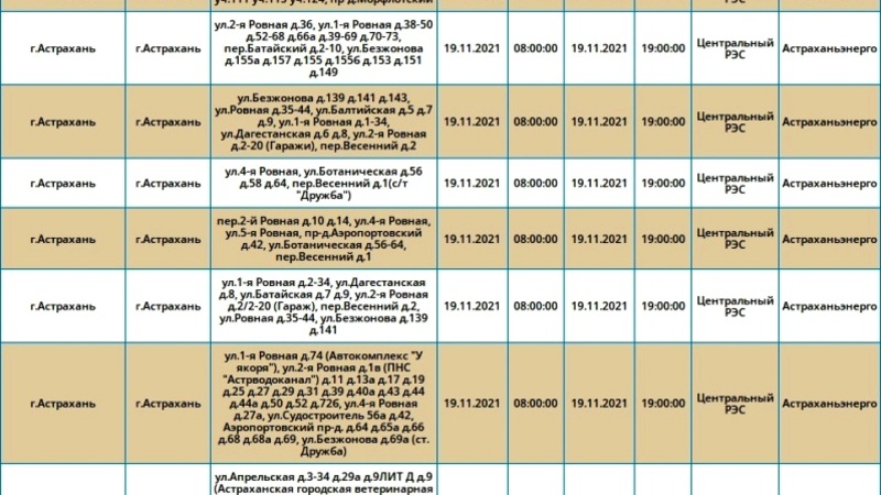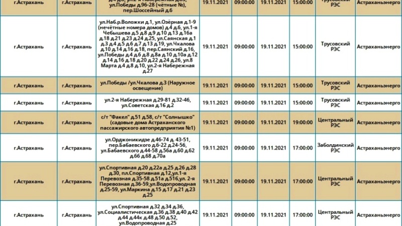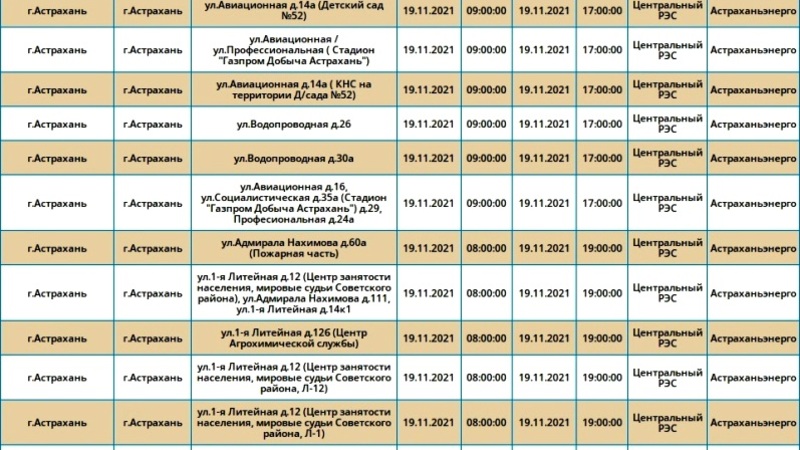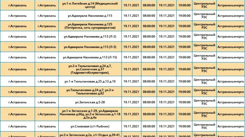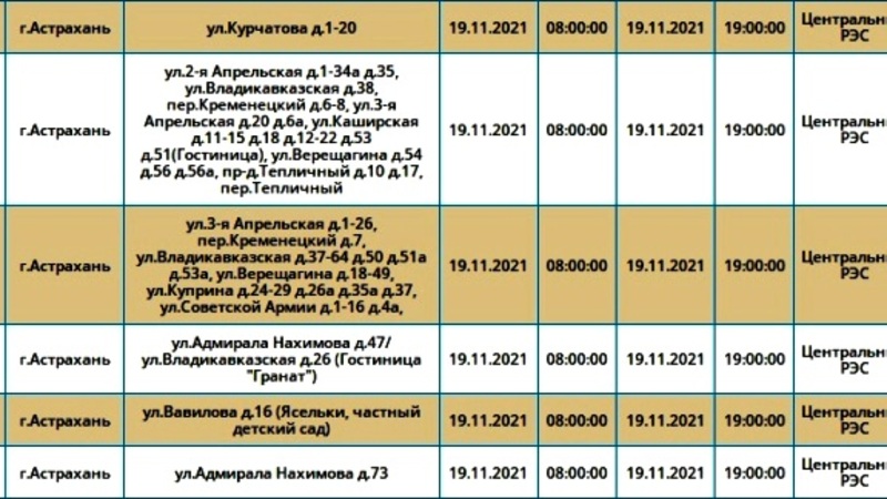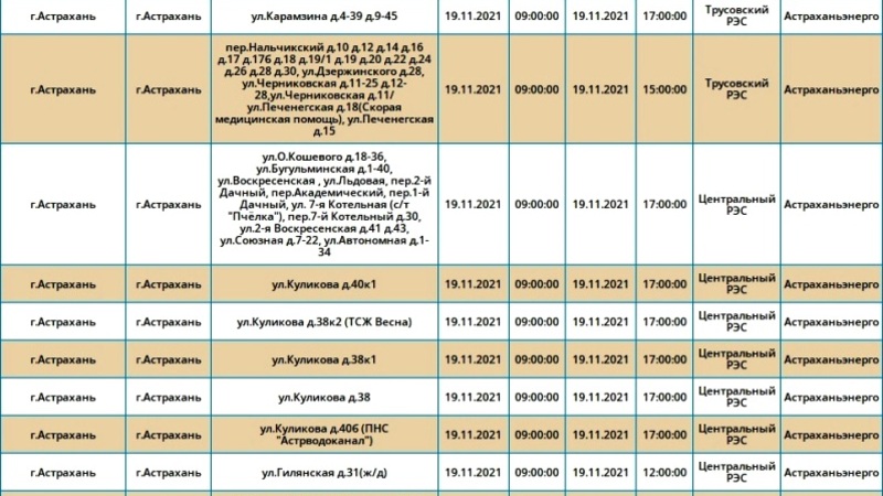 Адреса абонентов и время отключений в Астрахани на 19 ноября: