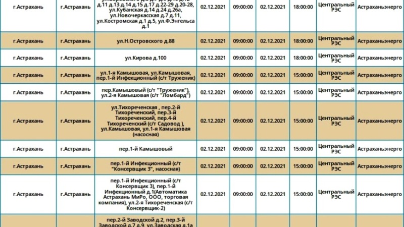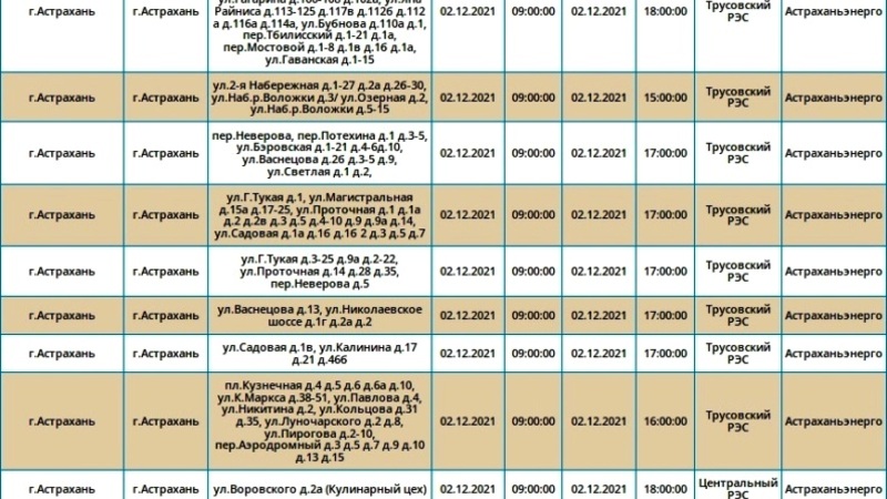 Адреса абонентов и время отключений в Астрахани на 2 декабря:
