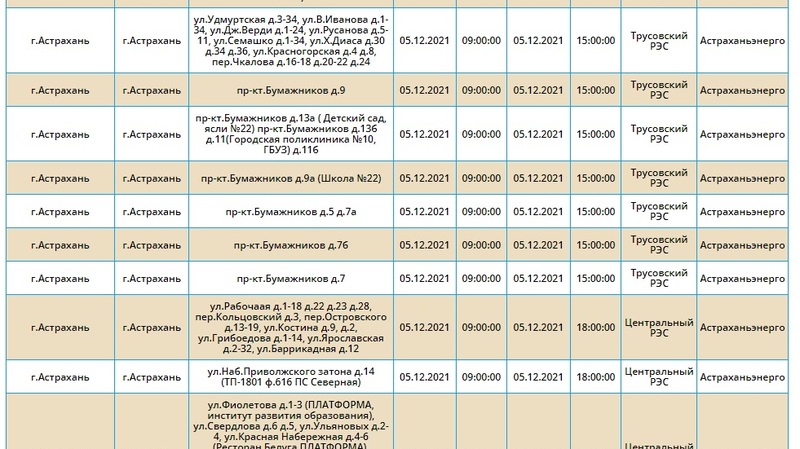 Как сообщает ПАО «Россети Юг – Астраханьэнерго», плановые отключения электроэнергии в воскресенье, 5 декабря 2021 года, по некоторым адресам начнутся уже в 8 утра и продолжатся до 18:00. Без света таким образом останутся в этот день жители ряда домов центральной и правобережной частей города, а также расположенные в этих зданиях предприятия и организации.