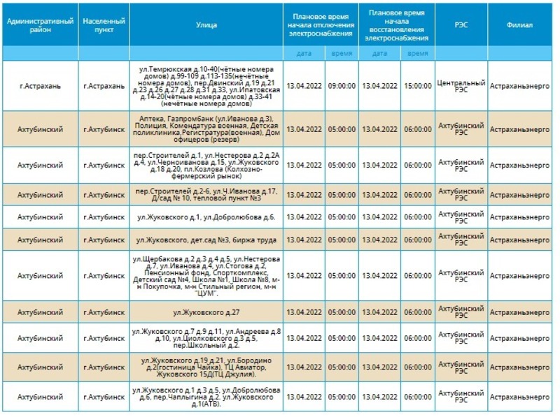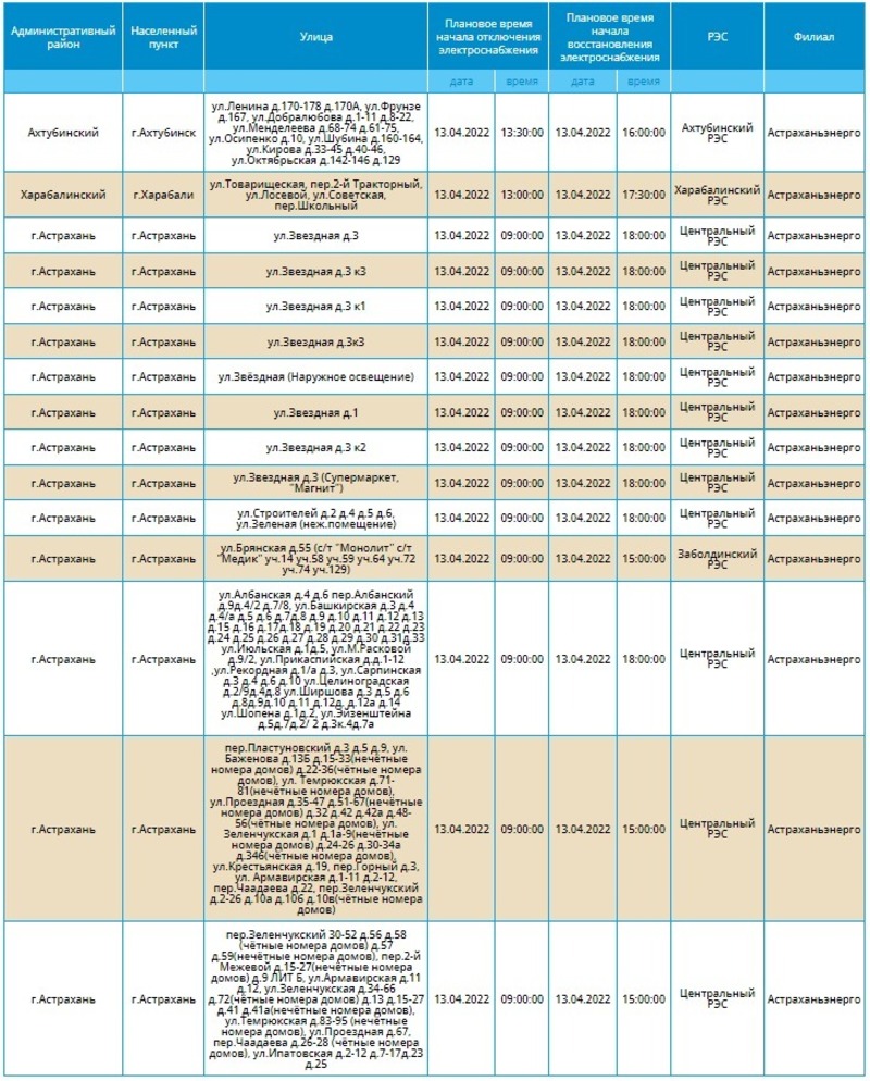 По информации компании «Россети Юг» на сегодня, 13 апреля 2022 года, запланированы отключения электричества на сетях в Астрахани, Ахтубинске и Харабалях.